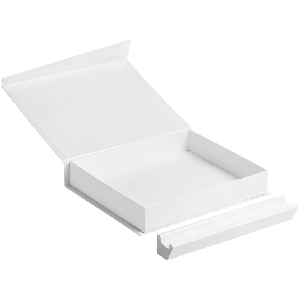 Коробка с клапаном на магните, выполнена из переплетного картона, кашированного белой дизайнерской бумагой Magic.