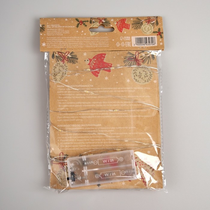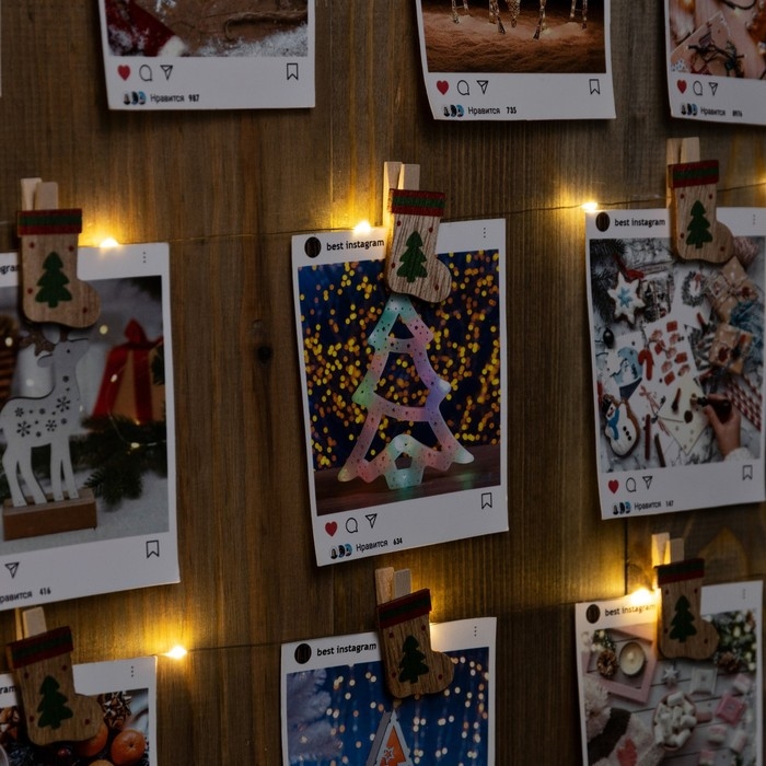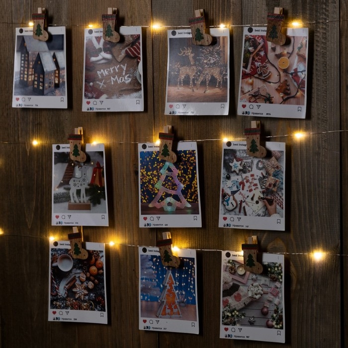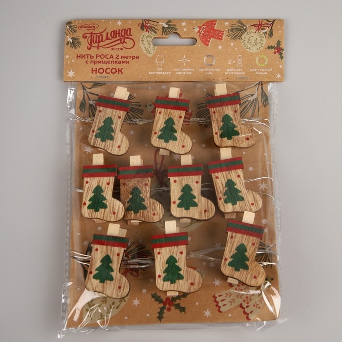 Гирлянда «Нить» 2 м роса с насадками «Прищепки-чулок», IP20, серебристая нить, 20 LED, батарейки ААх2 (не в комплекте), свечение тёплое белое