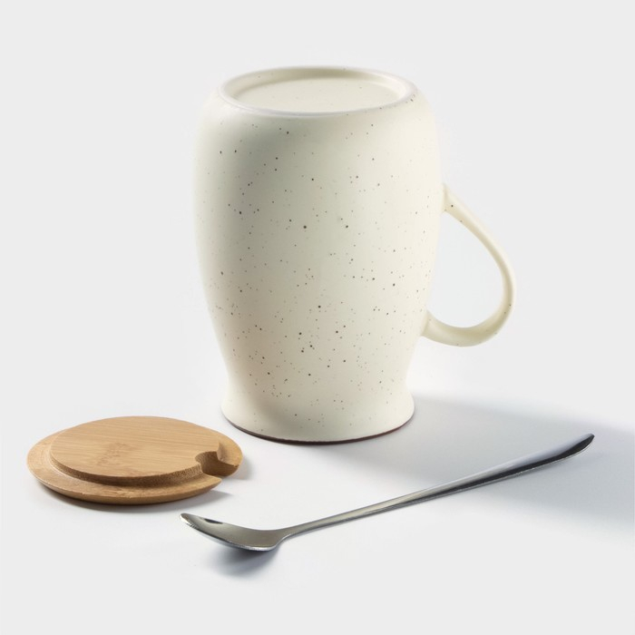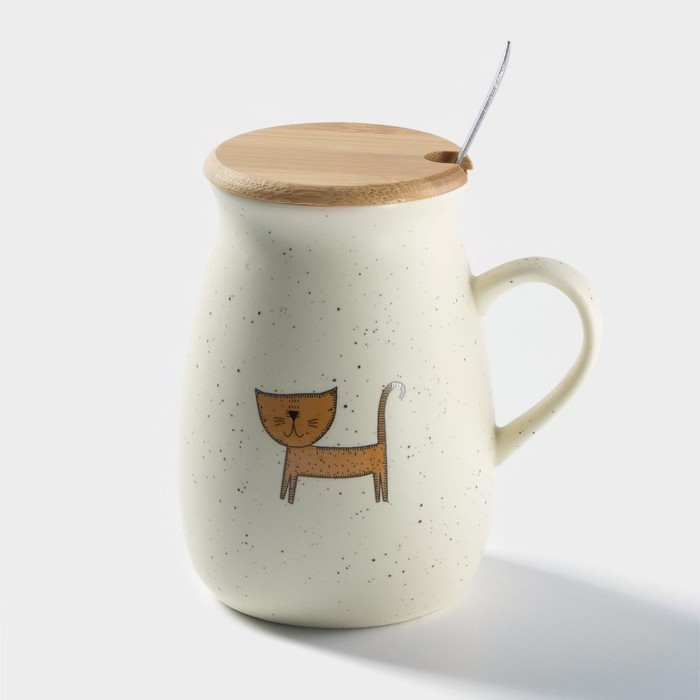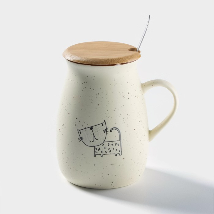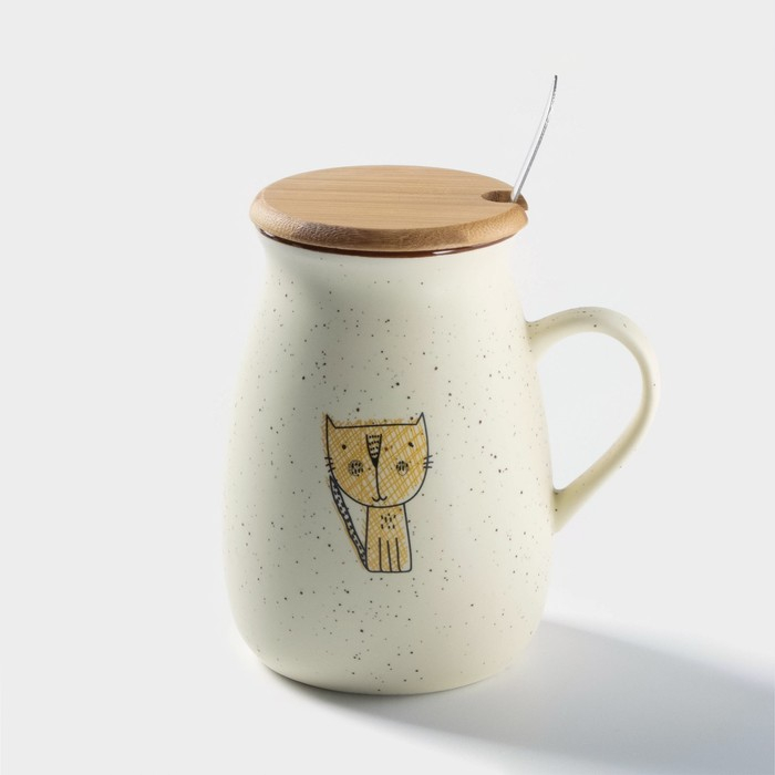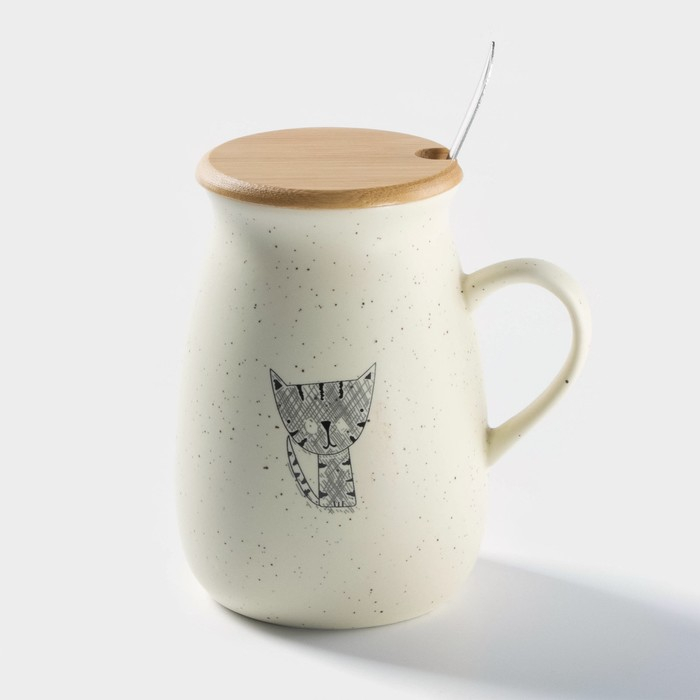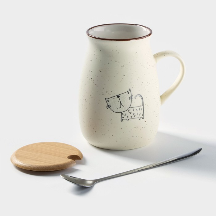 Кружка керамическая с деревянной крышкой и ложкой «Пэтти», 350 мл, рисунок МИКС
