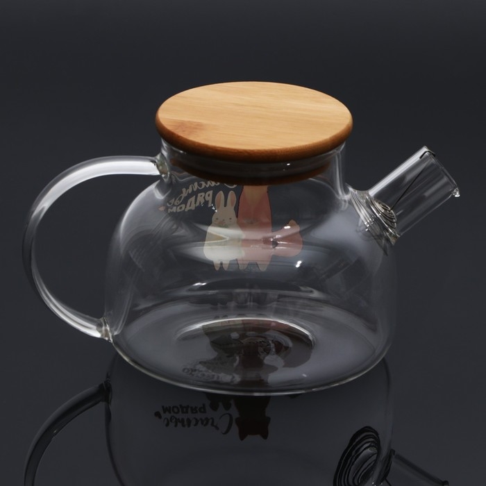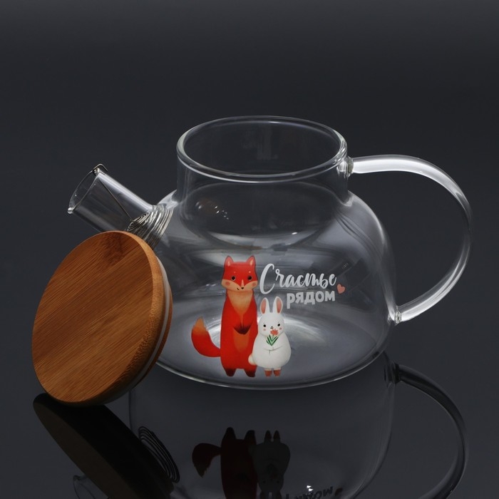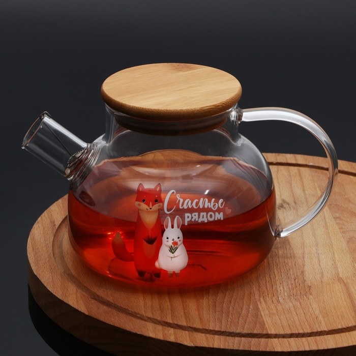 Чайник стеклянный заварочный с бамбуковой крышкой «Счастье рядом», 800 мл
