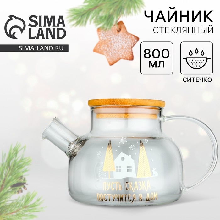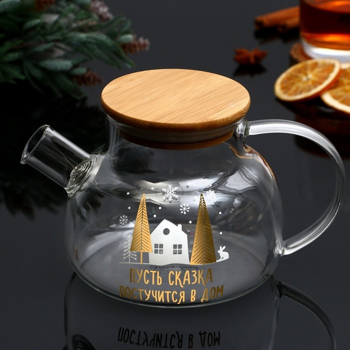 Новый год. Чайник заварочный стеклянный с бамбуковой крышкой «Сказка», 800 мл