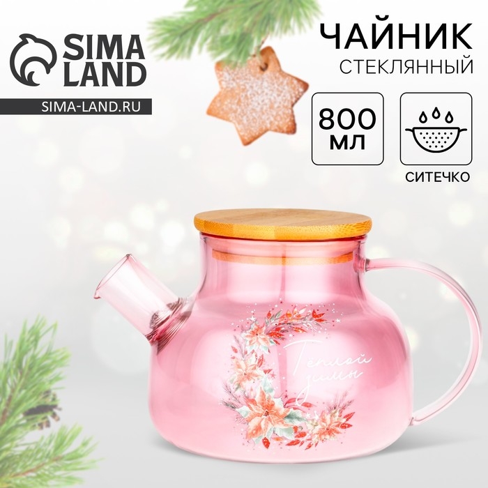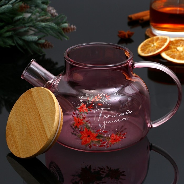Новый год. Чайник заварочный стеклянный с бамбуковой крышкой «Теплой зимы. Розовая сказка», 800 мл