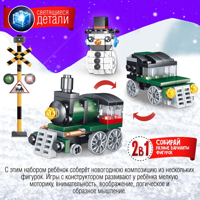 С конструктором «Новогодние истории. Поезд и снеговик» ребёнок прокачает мелкую моторику, логическое и пространственное мышление.