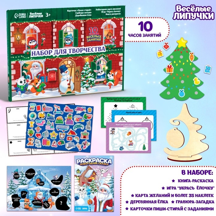 С этим волшебным набором вы сможете украсить ёлочку, подумать над головоломками, отгадать загадки-гравюры, составить карту желаний, и это ещё не всё!