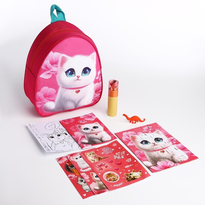 Детский рюкзак с блокнотом,раскраской,карандашами,пазлами и наклейками «Котик»