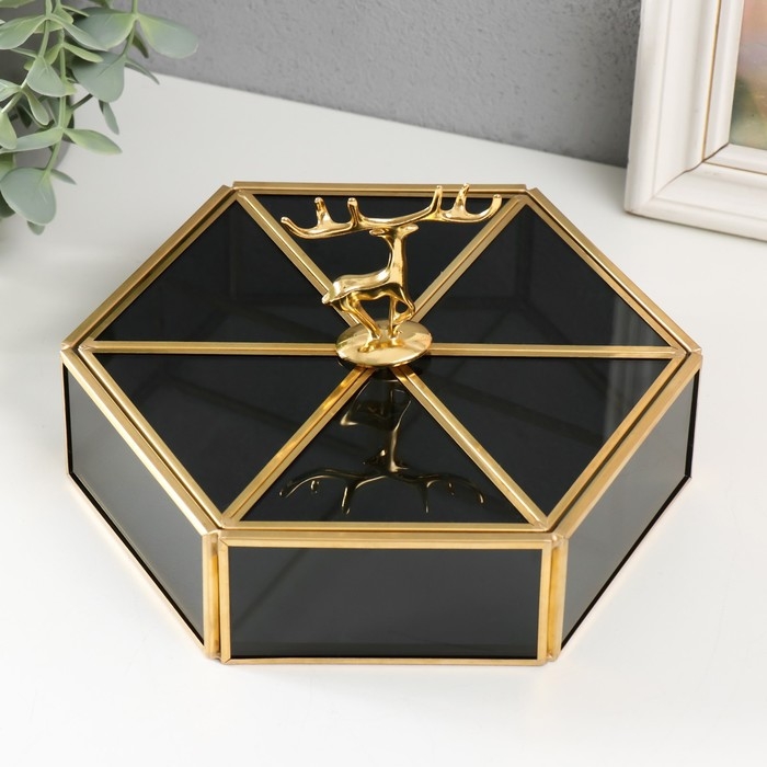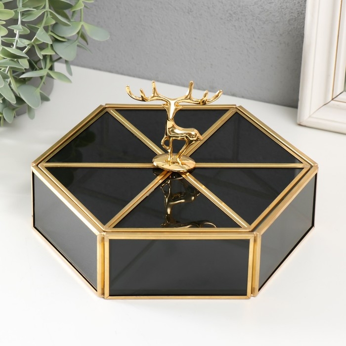 Шкатулка стекло с металлическим каркасом"Золотой олень" многогранник чёрная 20х17,5х11,2 см 99327