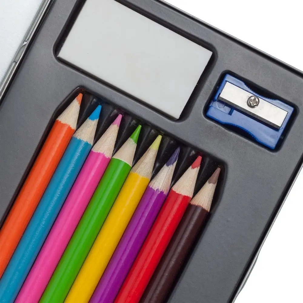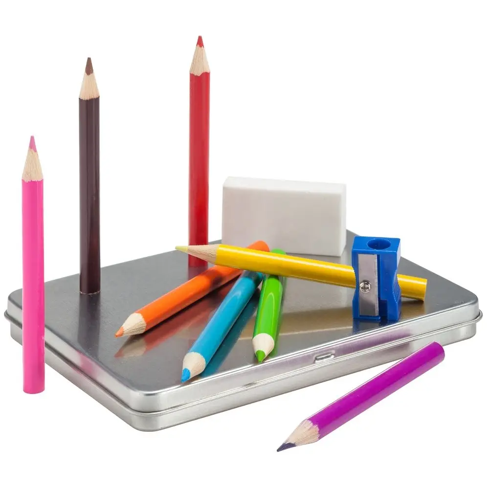 Набор из 8 цветных карандашей, ластика и точилки.