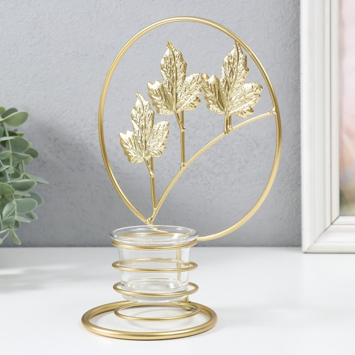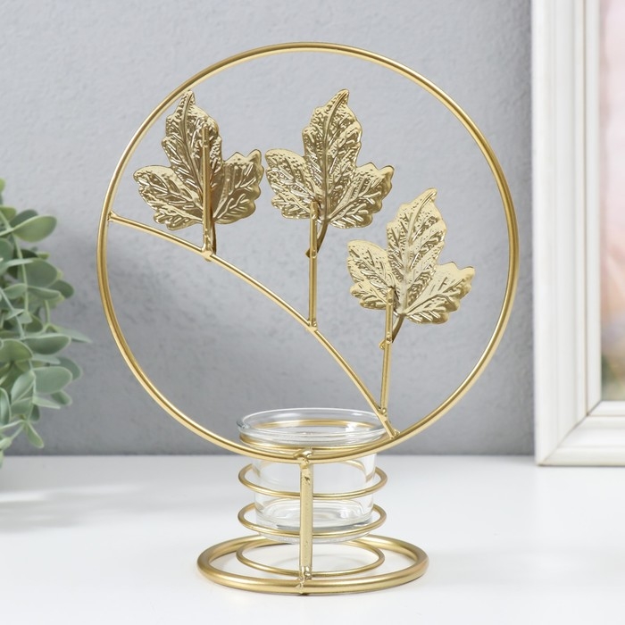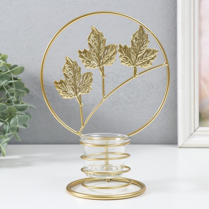Подсвечник металл на 1 свечу "Кленовые листья в круге" d=4,5 см золото 16х9,5х21 см