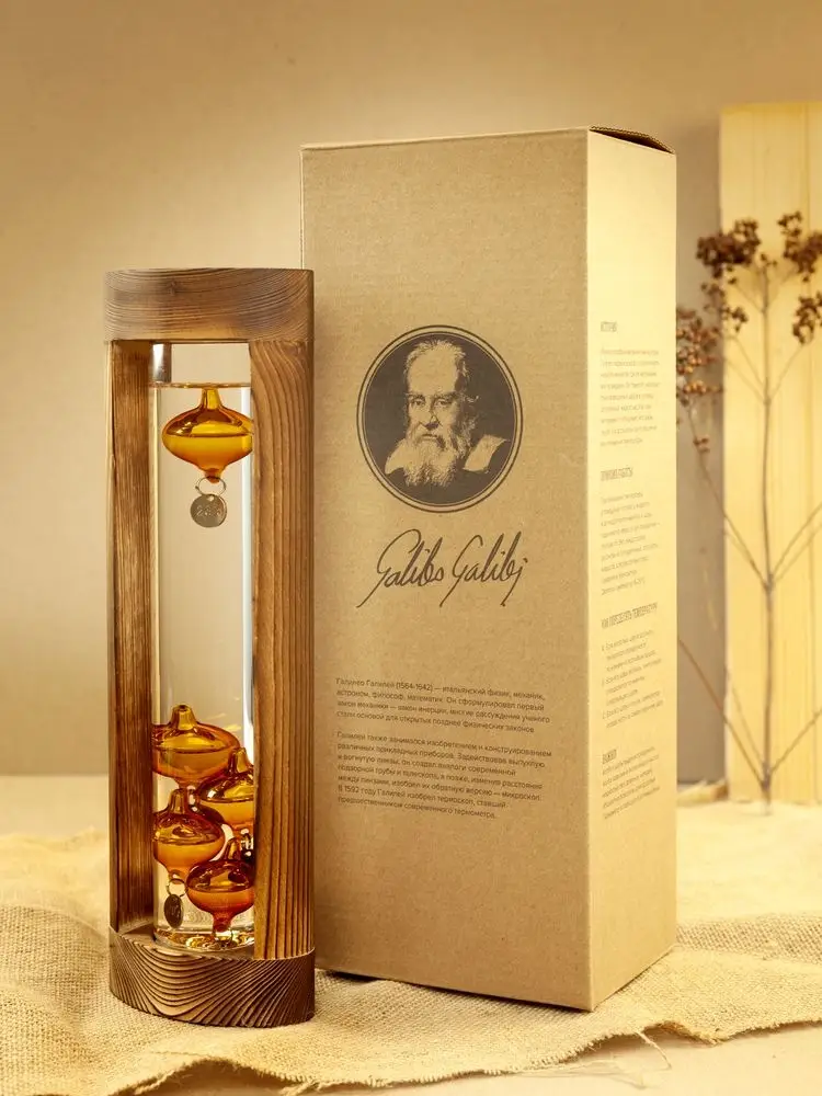 Любопытный термометр, изобретенный великим Галилео Галилеем, который первым обнаружил, что плотность жидкости увеличивается при снижении температуры и уменьшается при ее повышении.