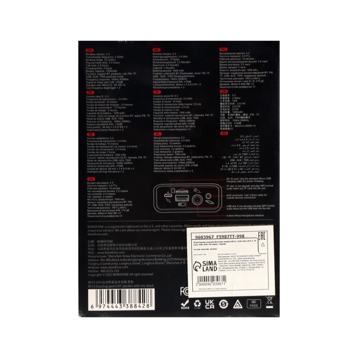 Портативная колонка Borofone модель BP13,10 Вт,1500 мАч,BT5.3,TFcard,USB,AUX,FM-радио,чёрная