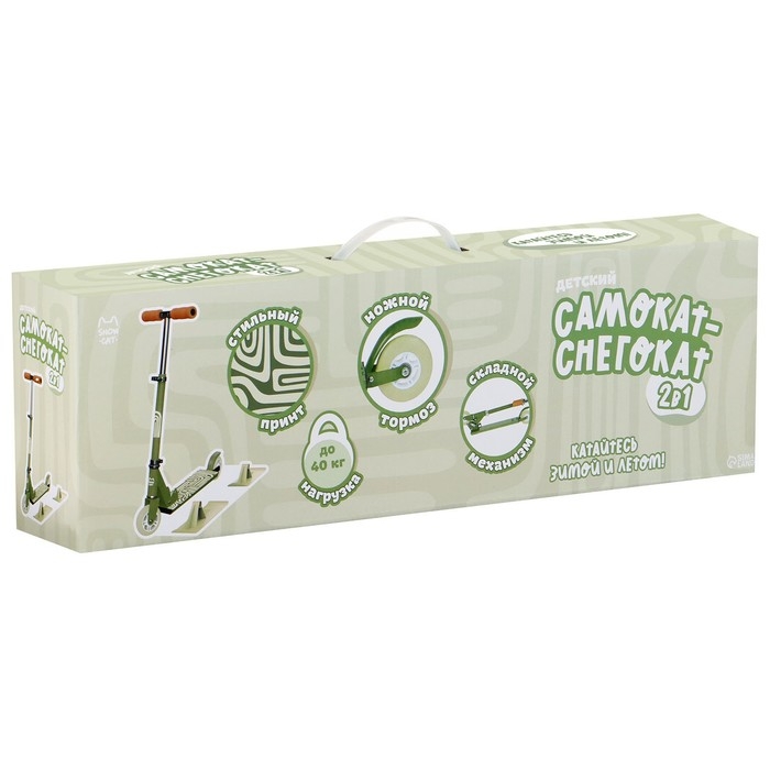 Детский самокат-снегокат предназначен для летнего и зимнего активного отдыха. Конструкция представляет собой раму самоката, на которую можно установить лыжи или колёса. Передняя лыжа/колесо управляется поворотом руля. На колёсах можно кататься по любым ровным поверхностям в сухое время года, на лыжах — по снегу.