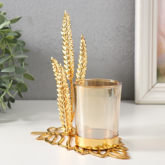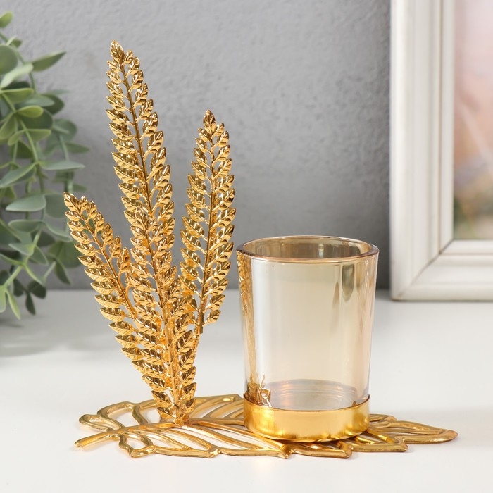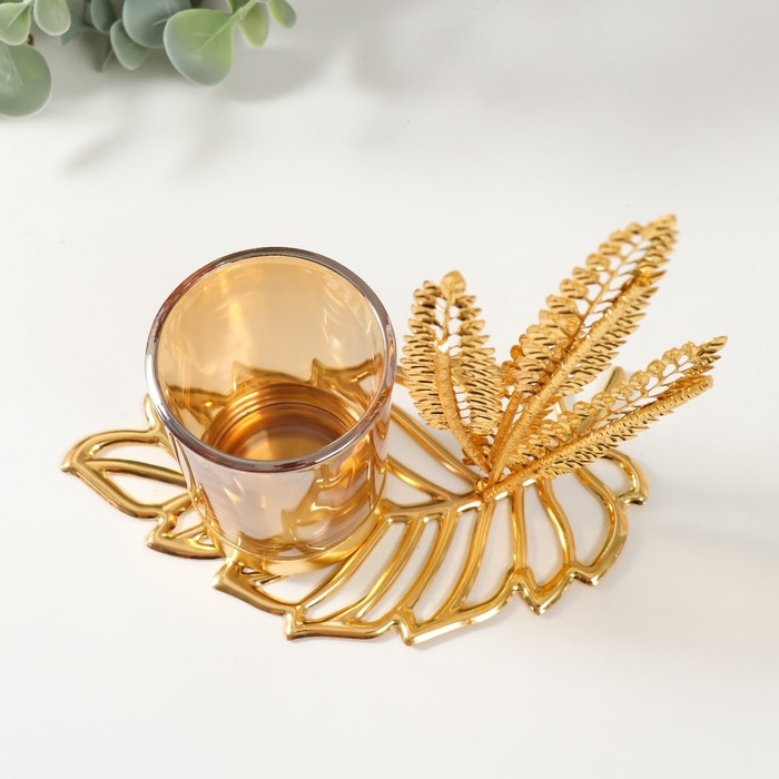 Подсвечник металл, стекло на 1 свечу "Высокие листы" d=4,7 см, золото 14,8х8х15 см