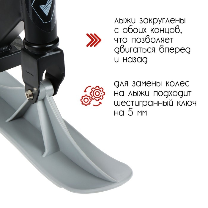 Самокат-снегокат актуален зимой и летом. На колёсах можно кататься по любым ровным поверхностям в сухое время года, зимой — на лыжах по снегу.