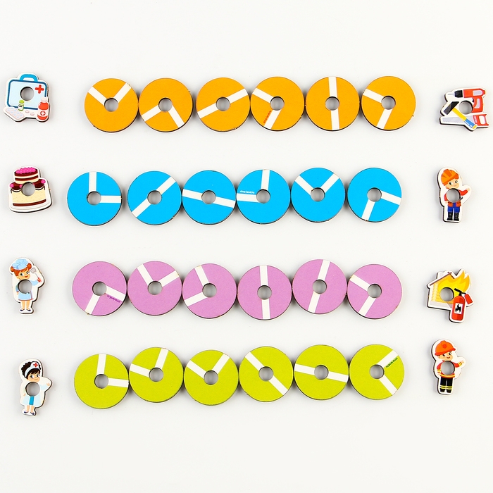 - С деталями. Наденьте на боковые штырьки несколько деталек с профессиями, а с другой стороны детали с предметами. Малыш должен составить пары и соединить их с помощью резиночки.