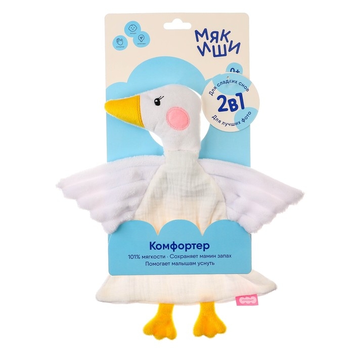 Такое изделие подойдёт ребёнку не только для крепкого сна, но и в качестве первой игрушки, так как оно не имеет твёрдых или острых деталей. Комфортер выполнен из плюшевой ткани, мягкой и приятной на ощупь.