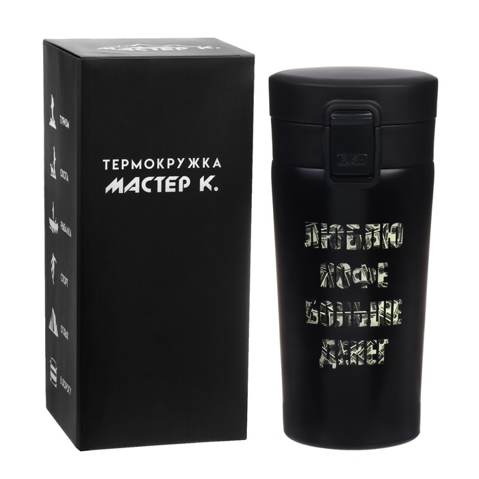 Термокружка для кофе и чая "Мастер К" идеальна для офиса, автомобиля, длительных прогулок и детям в школу. Благодаря специальному покрытию надежно лежит в руке.