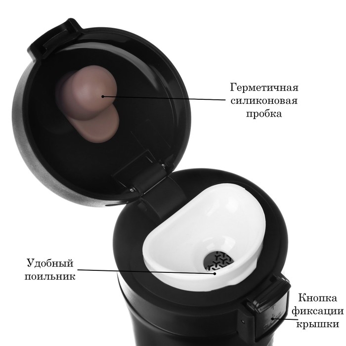 Термокружка сделана из нержавеющей стали марки 304, сконструирована по вакуумной технологии, с двойной стенкой, следовательно, долго держит тепло и не проливается. Снабжена откидывающейся крышкой, изготовленной из экологичного пищевого пластика, имеется кнопка с функцией блокировки, позволяющая с легкостью использовать термос одной рукой. На дне, термокружка имеет специальную прорезиненную основу, предотвращающую царапины на поверхностях.