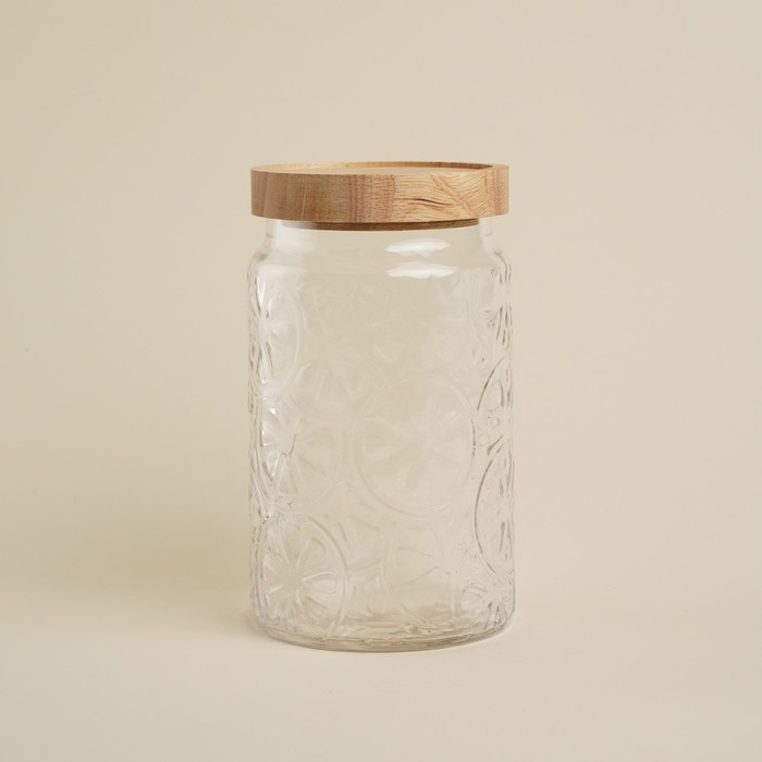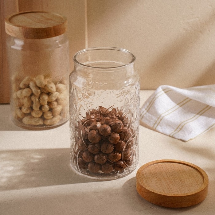Банка выполнена из прочного стекла с рельефной текстурой, что придает ей утонченный вид. Деревянная крышка из натурального материала обеспечивает надежное закрытие, защищая содержимое от влаги и загрязнений. Простая круглая форма и цилиндрический дизайн делают банку универсальной для любого интерьера.