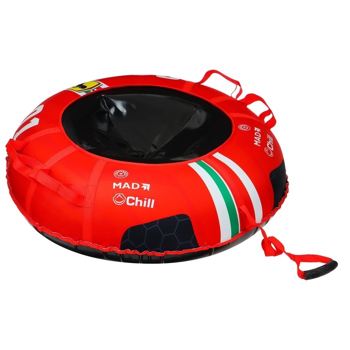 Дно тюбинга изготовлено из тентовой ткани плотностью 550–650 г/м², что гарантирует долгий срок службы и обеспечивает отличное скольжение. Снаряд оснащён безопасными ручками и молнией для быстрого доступа к камере. Имеет закрытую сердцевину, что исключает попадание снега внутрь. Для тюбинга подойдёт камера 15 дюймов. Предназначен для детей от 12 лет.
