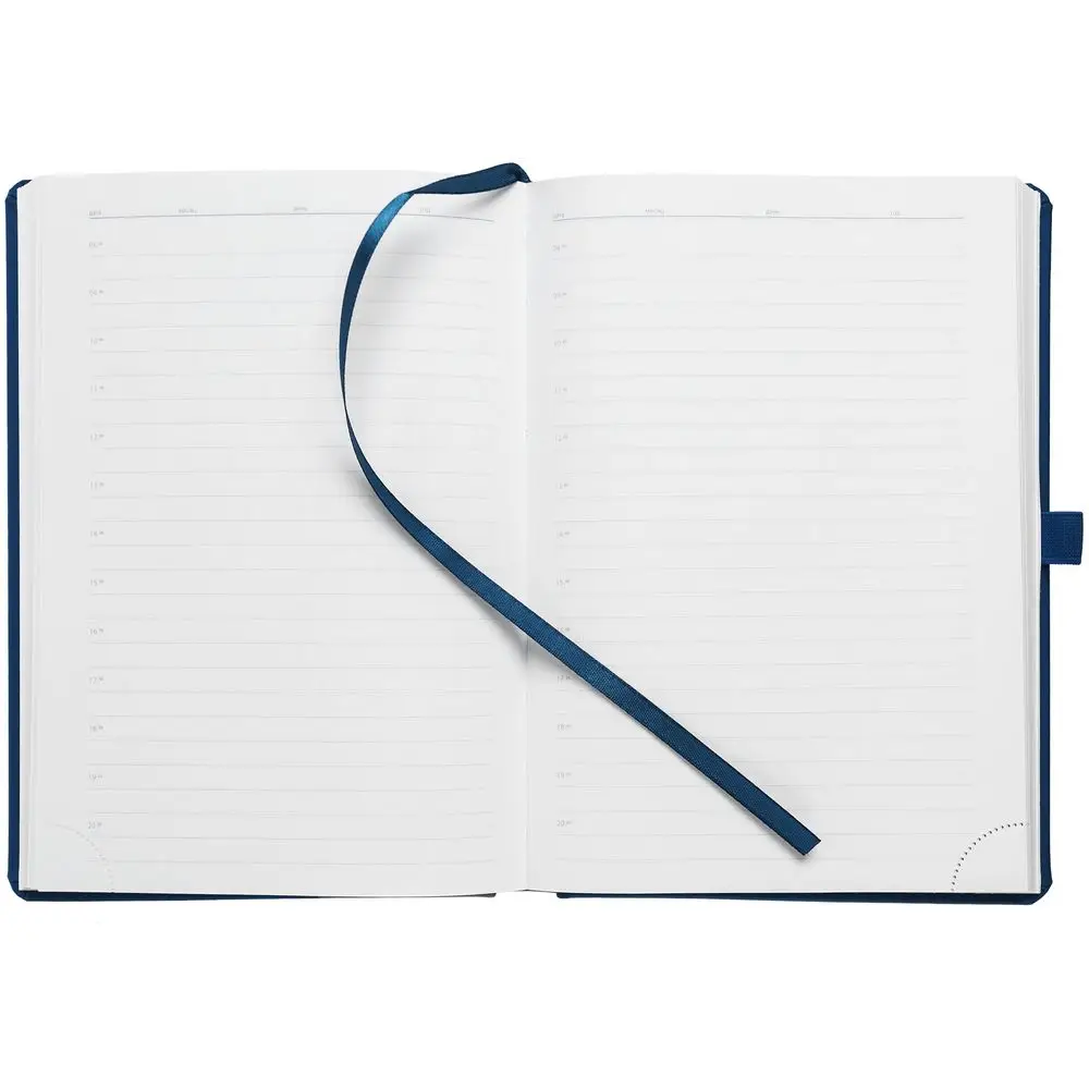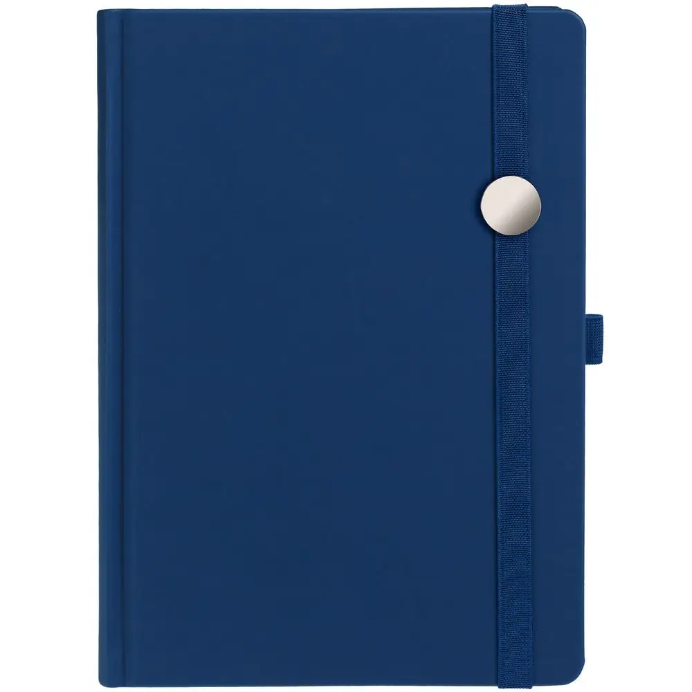 Ежедневник с твердой обложкой без поролона, выполнен из материала Soft Touch Ultra, синий НН, дополнен резинкой шириной 1 см, петлей-резинкой для ручки, капталом и ляссе синего цвета.