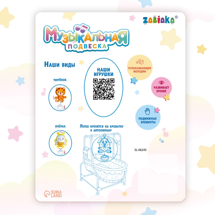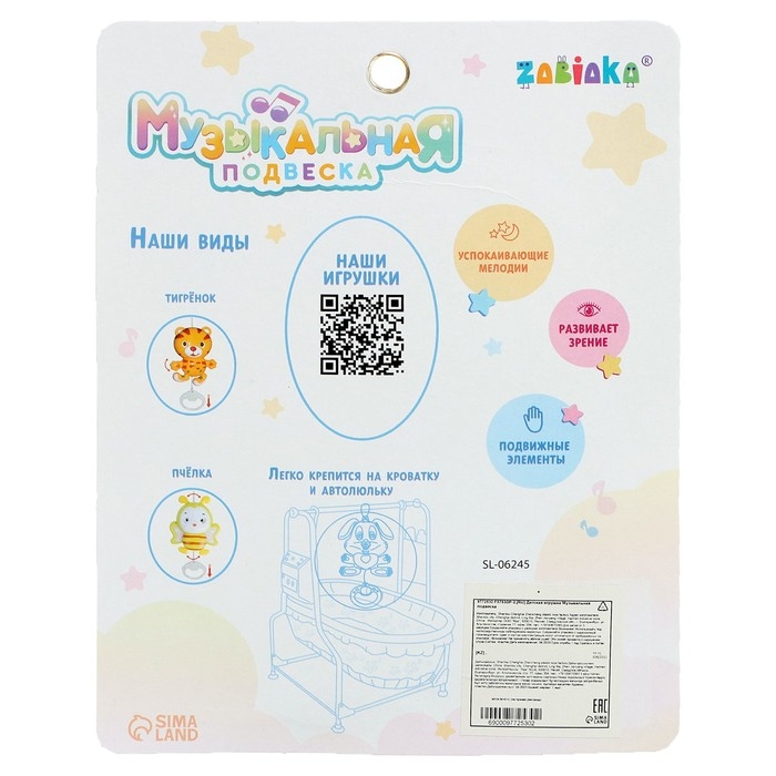- С помощью удобного крючка игрушка легко крепится на кроватку, коляску и автолюльку.