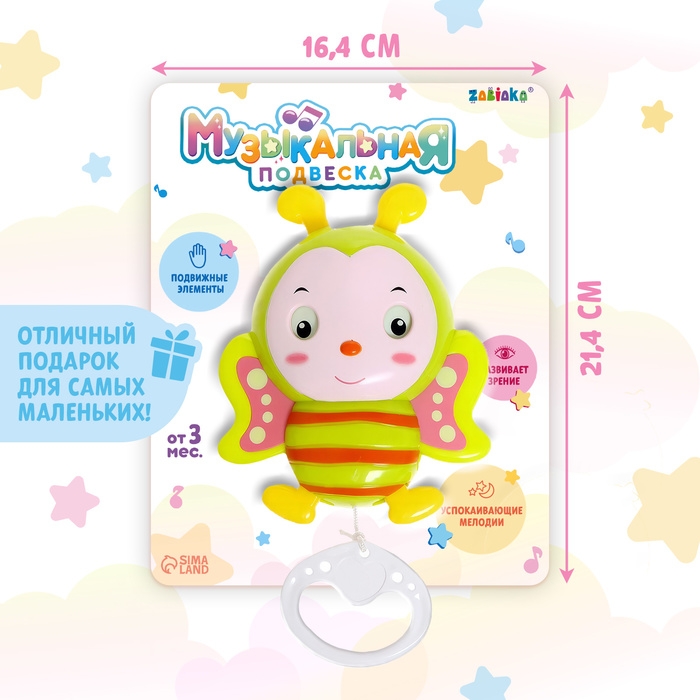Музыкальная подвеска разработана специально для малышей от 3 месяцев. Подвижные красочные игрушки привлекут внимание ребёнка, а звуки порадуют и успокоят его. Подвеска поможет малышу развить зрение, внимание, способность задерживать взгляд на предмете.
