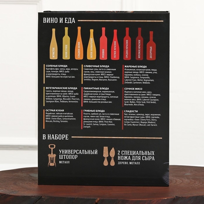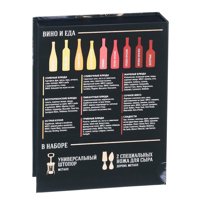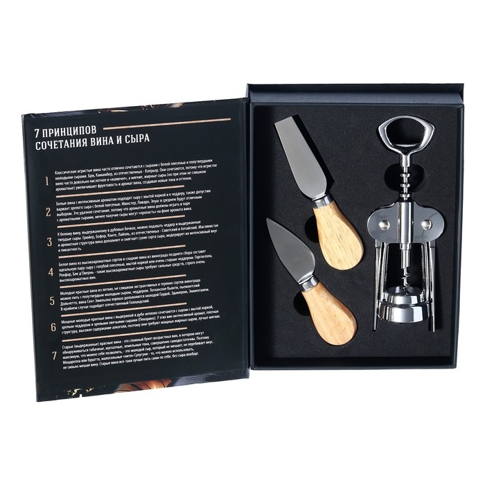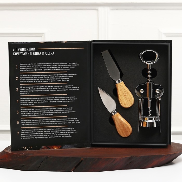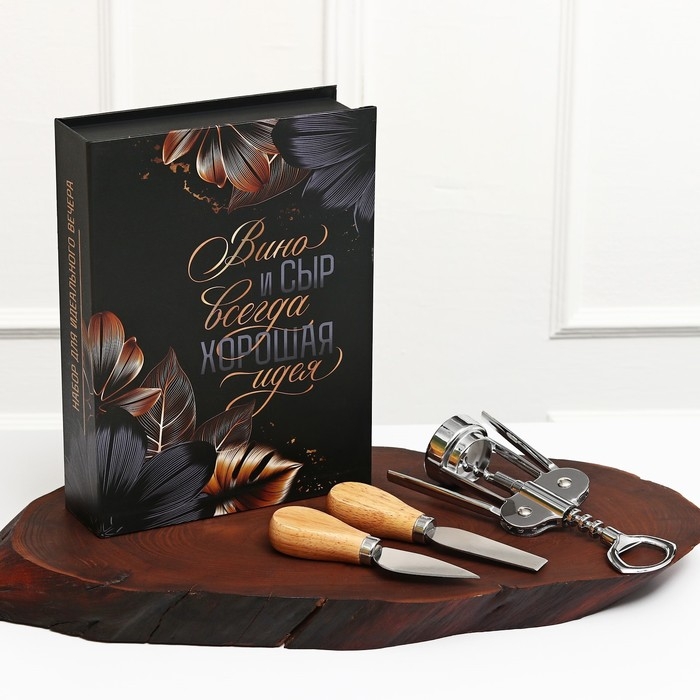 Набор для вина и сыра в книжке 'Для идеального вечера'. Штопор – это полезное и удобное приспособление для быта и просто необходимый предмет для работы сомелье и бармена, ведь без штопора открыть бутылку с напитком очень сложно. В повседневной жизни данное изделие называют штопором, а в профессиональной среде – нарзанником. В зависимости от поставленных целей среди широкого ассортимента нашей торговой марки вы можете выбрать штопор, полностью соответствующий вашим требованиям и задачам: классический, механический штопор-бабочка, винт. И конечно, подобное стильное и красивое изделие в подарочной упаковке станет отличным сюрпризом на Новый год или любой другой праздник для людей, которые ценят одновременно практичные и эстетичные подарки. В набор входит два ножа для сыра и штопор.