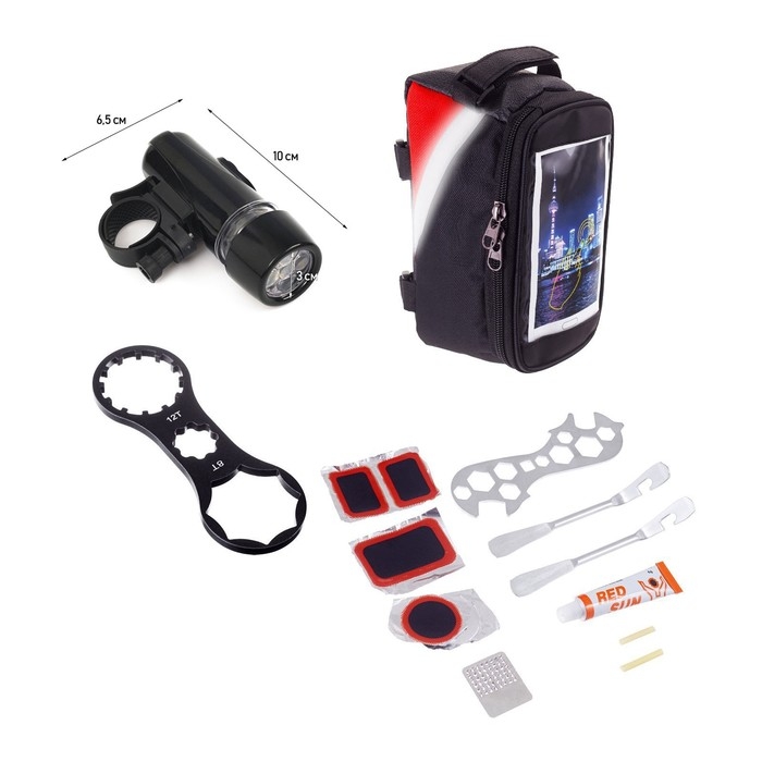 Набор для велосипеда 3 в 1: ремонтный набор, велосипедный ключ, сумка. Набор инструментов для велосипеда необходим для выполнения различных работ по обслуживанию и ремонту велосипеда. С помощью такого набора вы сможете самостоятельно устранить большинство неисправностей, а также провести профилактический осмотр и настройку своего велосипеда. Например, можно заменить камеру или покрышку, настроить тормозную систему, выполнить ремонт рамы или вилки. В набор входит: черная сумка из нейлона с красно-серым дизайном, с элементами из пластика и отдельным отделением под телефон (на липучке), которую можно прикрепить на раму велосипеда; 1 комбинированный (семейный) ключ выполнен из металла, 2 монтировки (монтажки) для перебортовки колес выполнены из металла, 5 заплаток для шин, 1 клей, 1 наждачка для зачистки, 2 резинки на ниппель, ключ накидной для снятия топкэпа вилок велосипеда, черный фонарик (10 х 6,5 см). Фонарь велосипедный передний, 50 лм, 5 led, 4 ААА, 3 режима. Специально для вашей ночной или вечерней поездки. Универсальность и безопасность - вот главные характеристики данной модели. Вы можете взять его с собой, например, в поход, на рыбалку, или же он вам пригодится во время кемпинга.