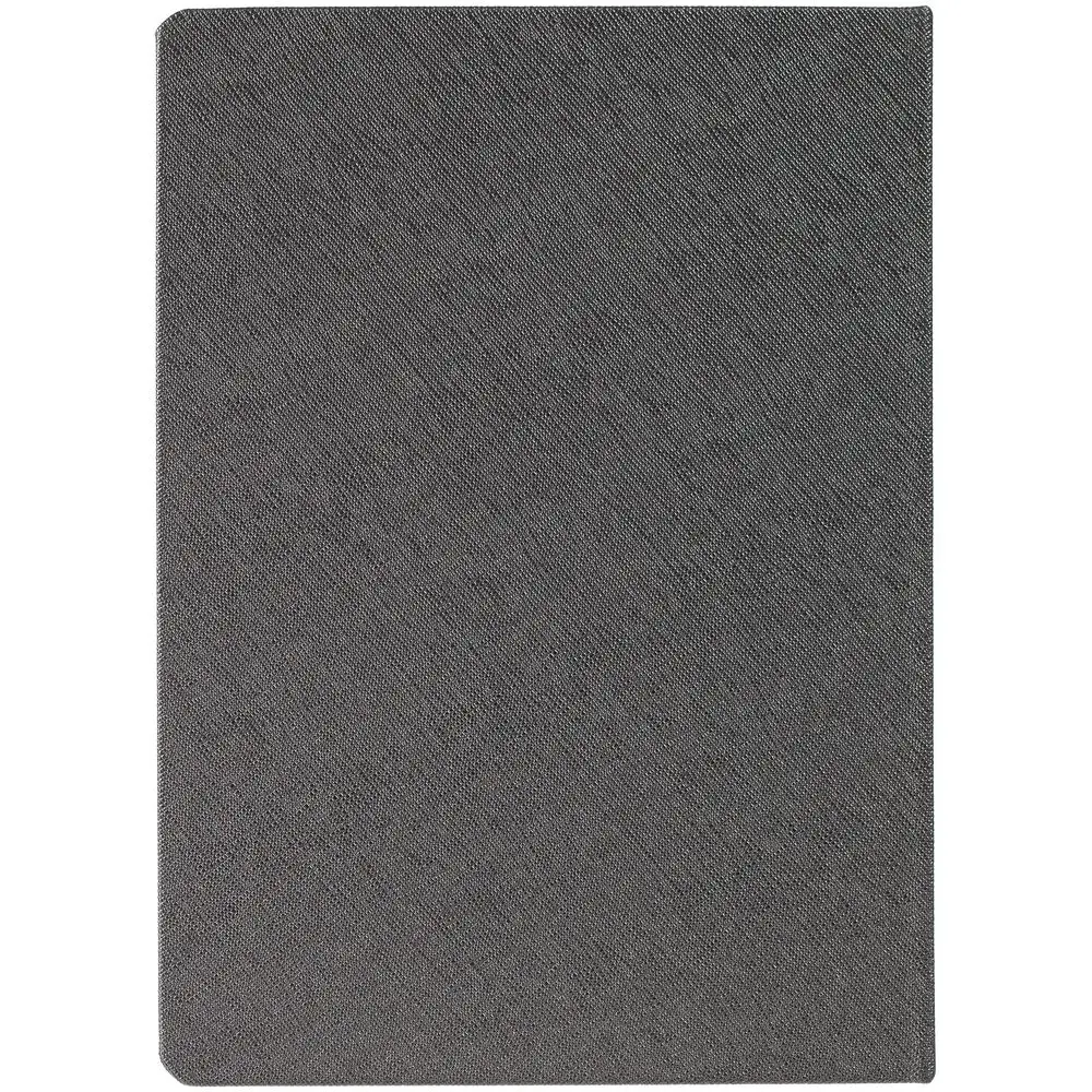 Ежедневник с твердой обложкой и серебристым обрезом, выполнен из материала Saffian, темно-серый, дополнен ляссе в цвет обложки.