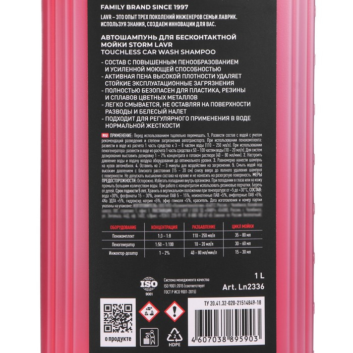 Автошампунь LAVR Storm бесконтактный, повышенная пенность 1:100, 1 л, бутылка Ln2336