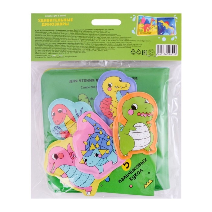 Книжка для ванной «Удивительные динозавры», 15 × 15 см, с пальчиковыми куклами