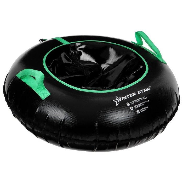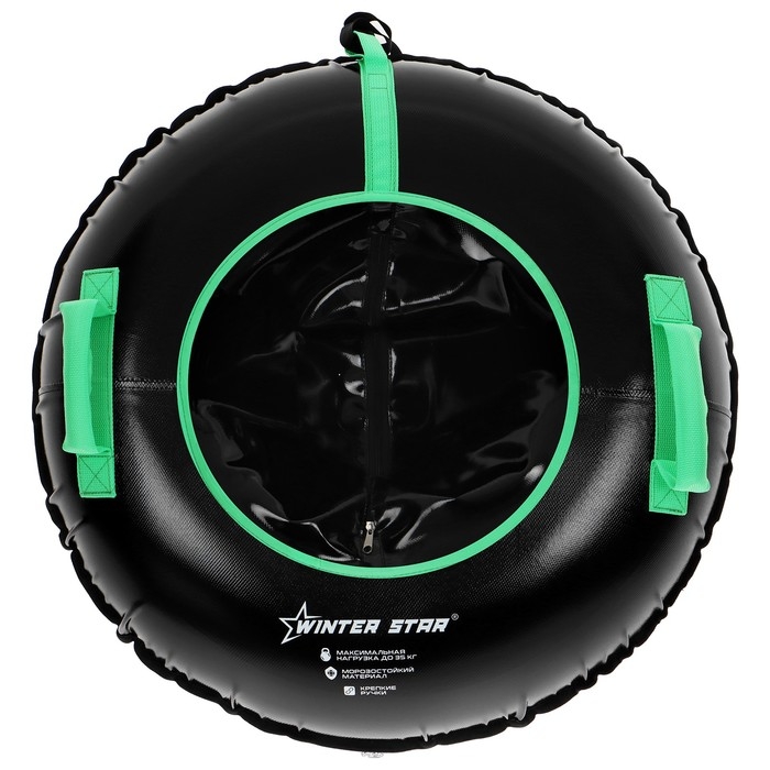 Дно тюбинга изготовлено из тентовой ткани, что гарантирует долгий срок службы и обеспечивает отличное скольжение. Снаряд оснащён безопасными ручками и молнией для быстрого доступа к камере. Имеет закрытую сердцевину — это исключает попадание снега внутрь. Для тюбинга подойдёт камера 12 дюймов. Предназначен для детей от 4 лет.