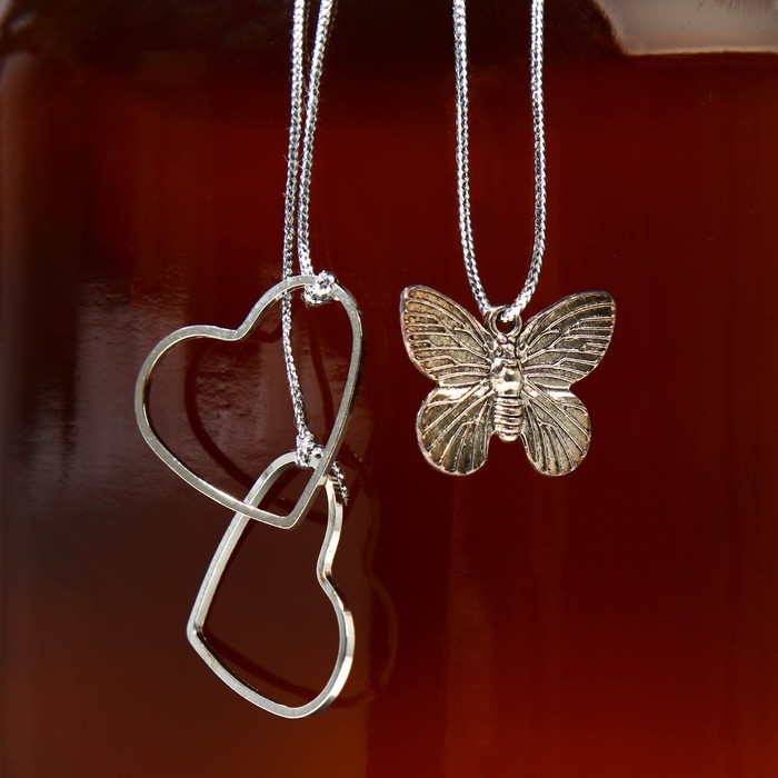 На вазе подвешены две подвески в виде сердец и бабочки.