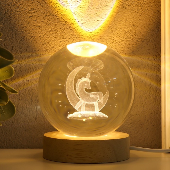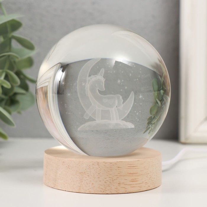 Сувенир стекло подсветка "Единорог на месяце" d=8 см подставка дерево, USB 8х8х9,5 см