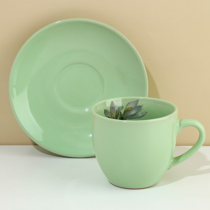 Чайная пара керамическая «Лист», 2 предмета: кружка с ложкой 180 мл, блюдце d=13,5 см, цвет белый