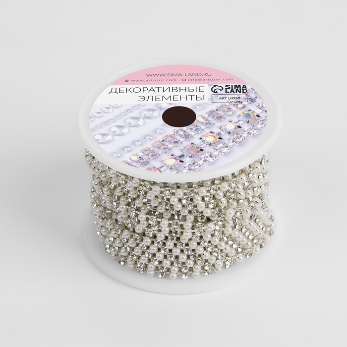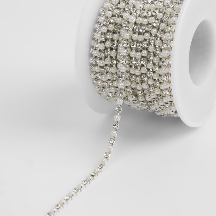 Цепь со стразами и жемчугом, металл, пластик, стекло, 2,5 мм, 9 ± 1 м, цвет серебряный