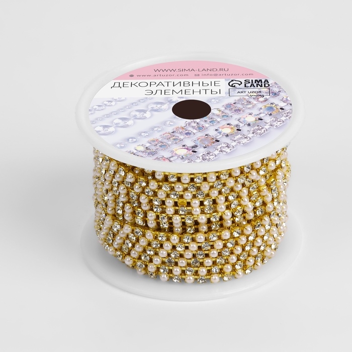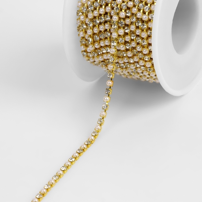 Цепь со стразами и жемчугом, металл, пластик, стекло, 2,5 мм, 9 ± 1 м, цвет золотой