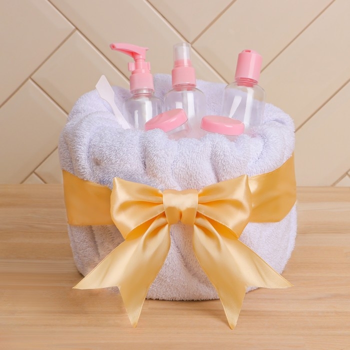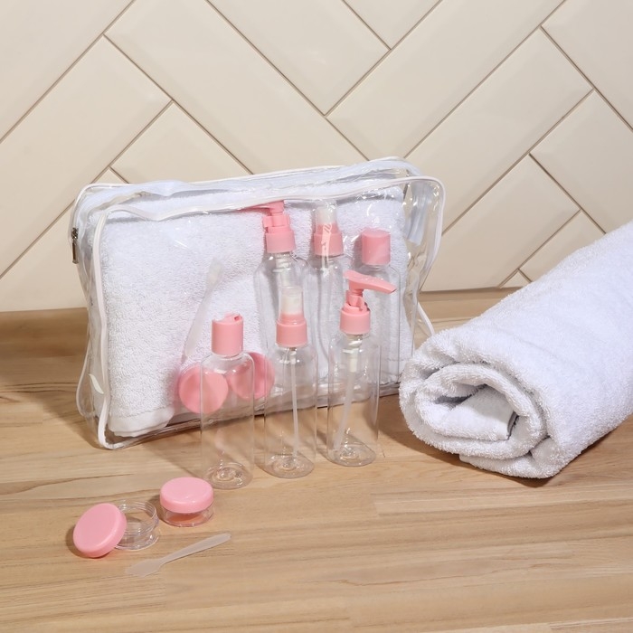 Набор банный, в косметичке, 7 предметов (полотенце 70 × 140 см, бутылочки 3 шт, баночки 2 шт, лопатка) , цвет белый/розовый