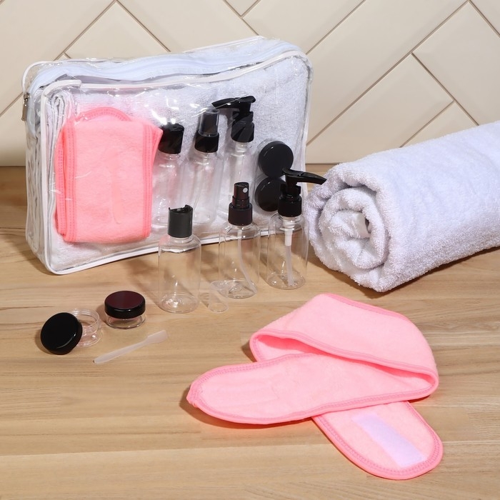 Набор банный, в косметичке, 8 предметов (полотенце 70 × 140 см, бутылочки 3 шт, баночки 2 шт, повязка на голову, лопатка) , цвет белый/розовый
