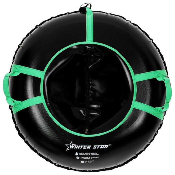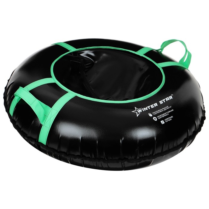 Дно тюбинга изготовлено из тентовой ткани, что гарантирует долгий срок службы и обеспечивает отличное скольжение. Снаряд оснащён безопасными ручками и молнией для быстрого доступа к камере. Имеет закрытую сердцевину — это исключает попадание снега внутрь. Для тюбинга подойдёт камера 13 дюймов. Предназначен для детей от 5 лет.