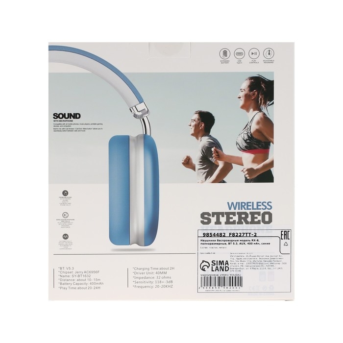 Наушники беспроводные RX-8, полноразмерные, микрофон, BT 5.3, AUX, 400 мАч, синие