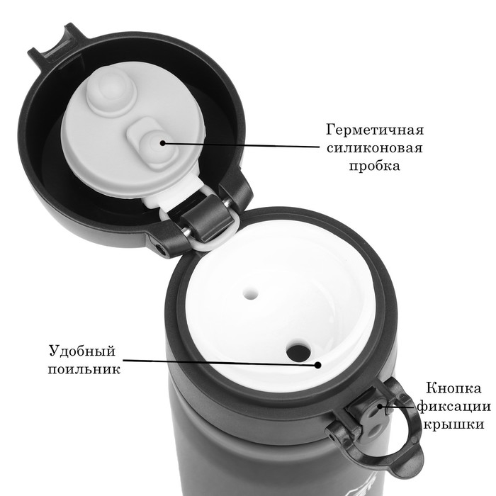 Термос (термокружка) сделан из нержавеющей стали 18/8, сконструирован по вакуумной технологии, с двойной стенкой, следовательно, долго держит тепло и не проливается. Снабжен откидывающейся крышкой, изготовленной из экологичного пищевого пластика, имеется кнопка, позволяющая с легкостью использовать термос одной рукой.