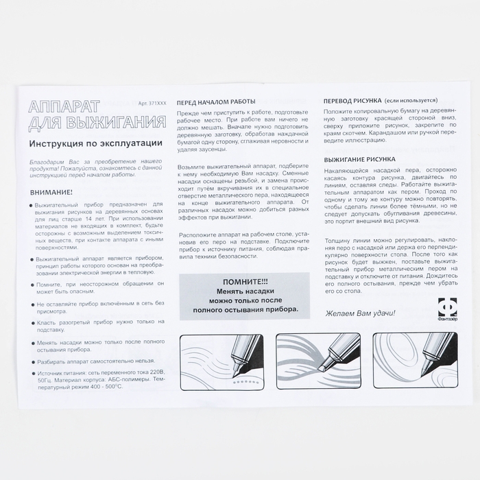 Современный выжигательный аппарат в комплекте с разнообразными насадками позволяет рисовать линии различной толщины и формы, что делает процесс творчества не только интересным, но и точным.