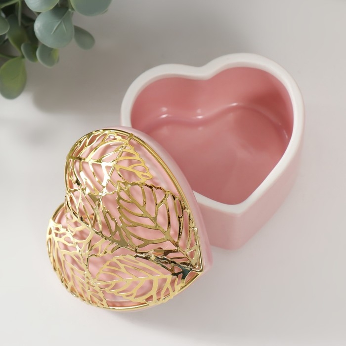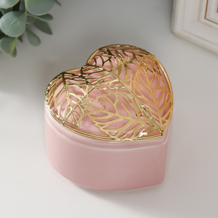 Шкатулка керамика, металл "Сердце с листьями" розовая 9х8,5х7,2 см
