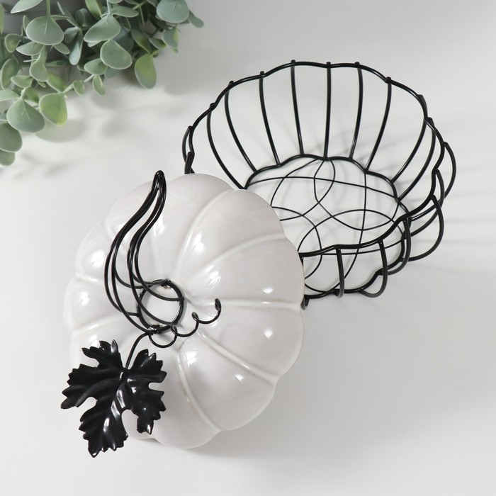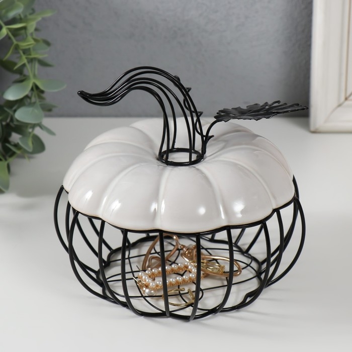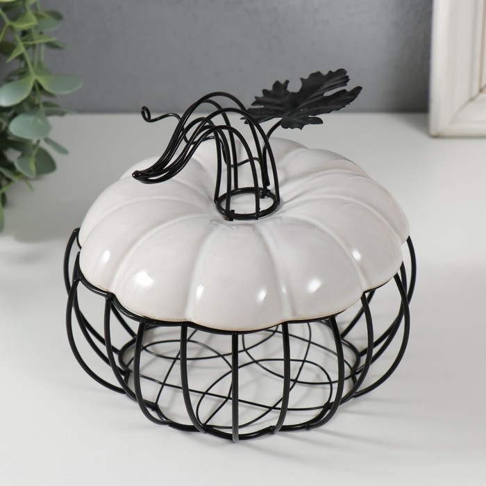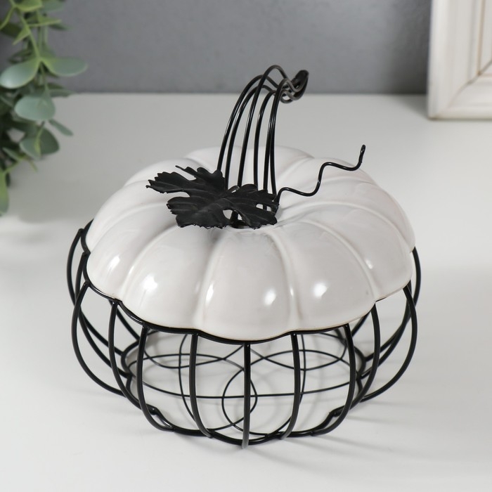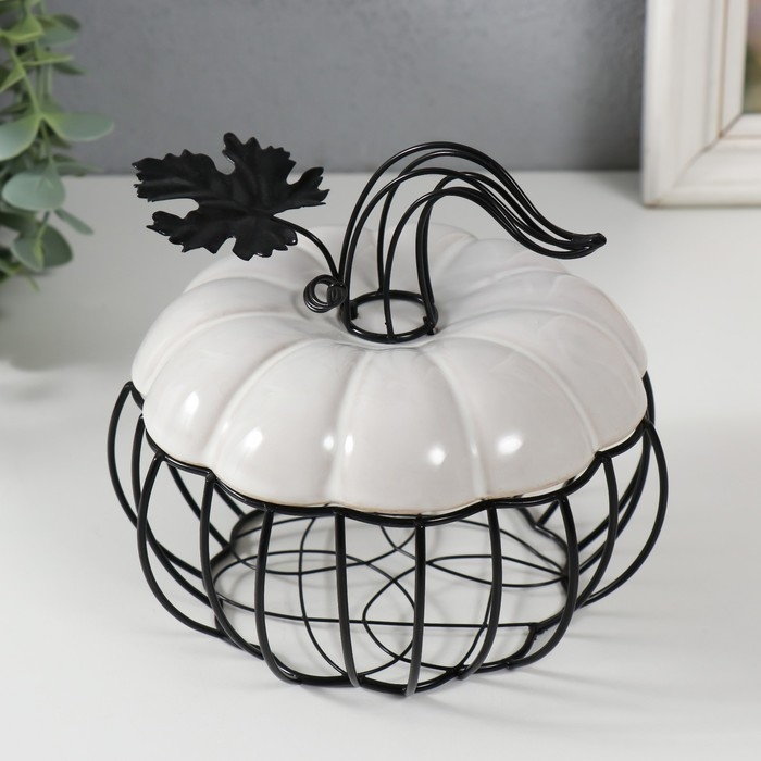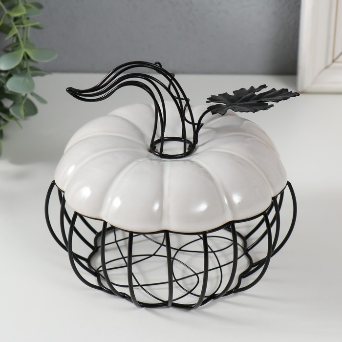 Шкатулка металл, керамика "Тыква с листочком" белая с чёрным 14х14х13 см