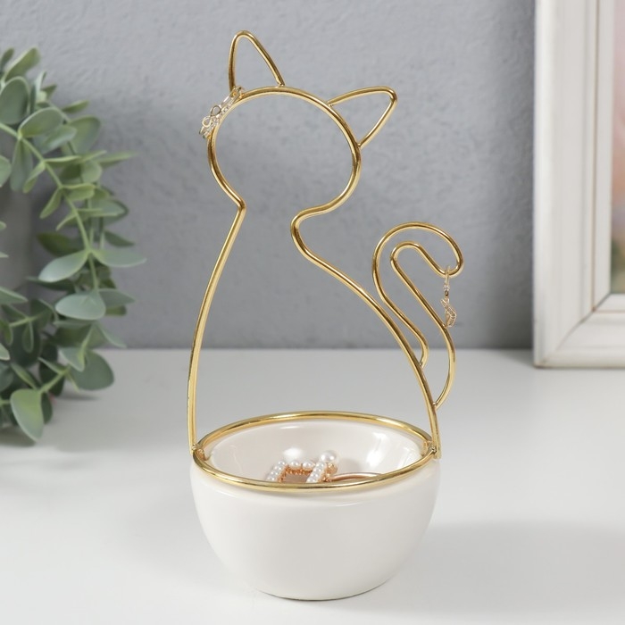 Сувенир керамика, металл подставка "Кошка" белая с золотом 9,8х8,3х17,7 см
