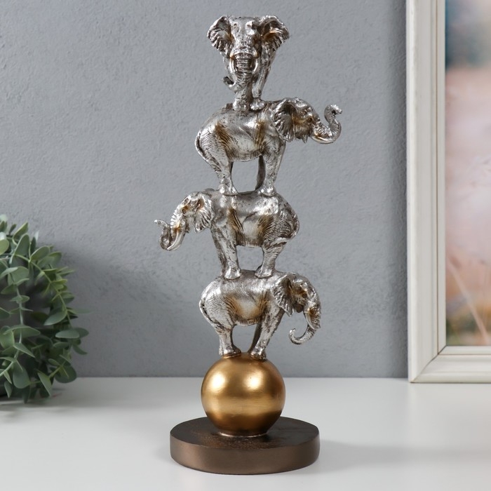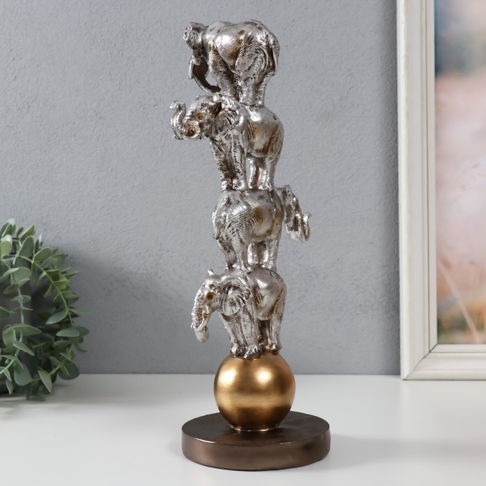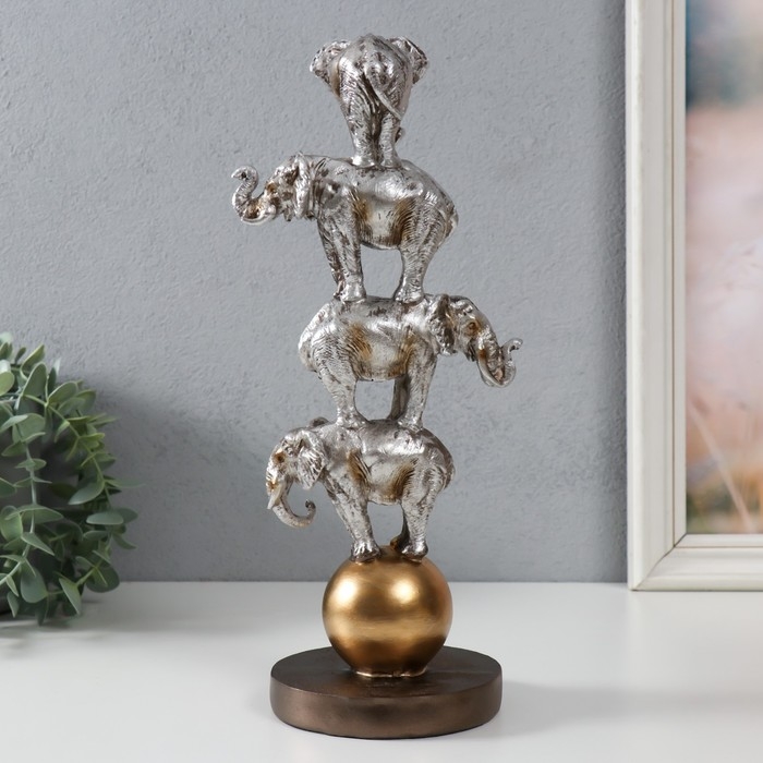 Сувенир полистоун "Четыре слона на шаре - пирамида" серебро 13,1х11,1х31 см
