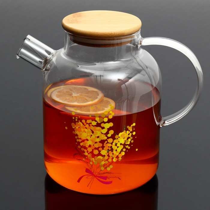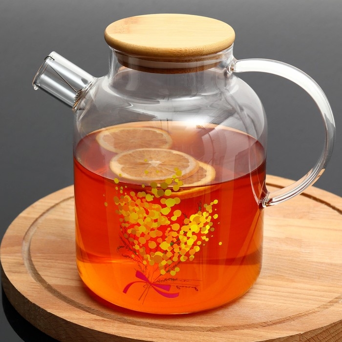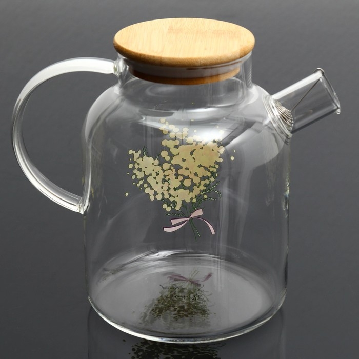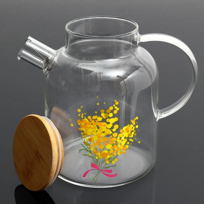 Чайник стеклянный заварочный с бамбуковой крышкой «Нежная мимоза», 1700 мл