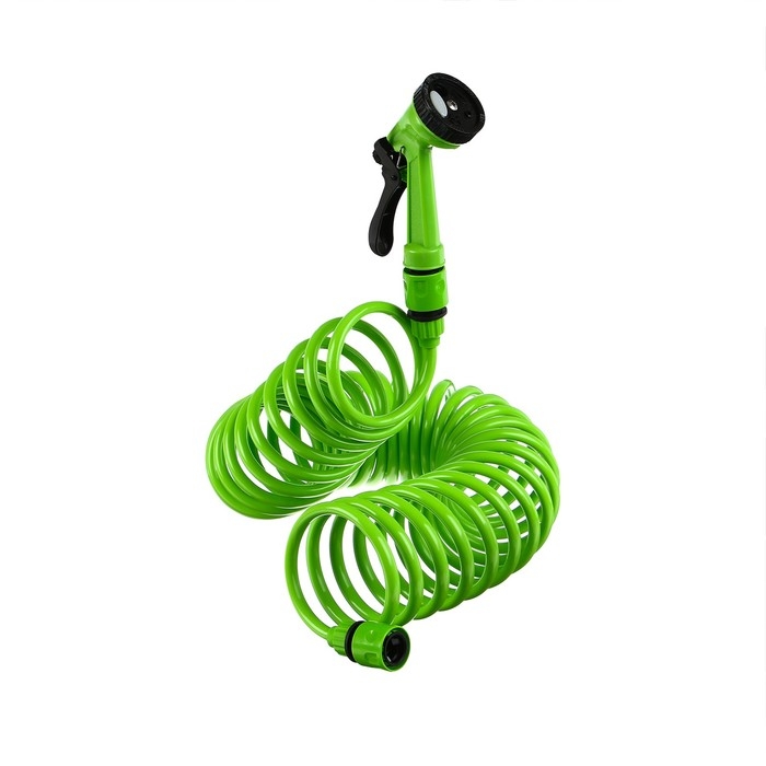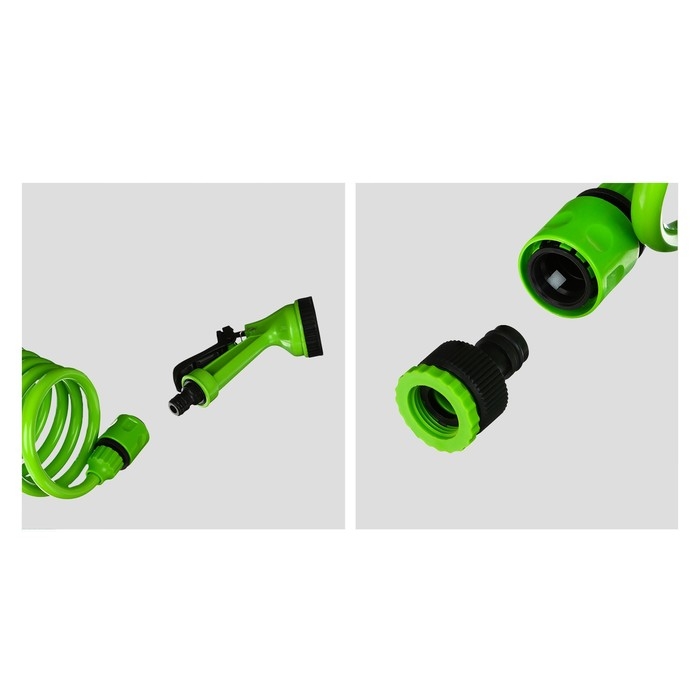 Шланг поливочный спиральный, 10 м, быстросъёмный, с поливочным пистолетом и штуцером, зелёный, Greengo