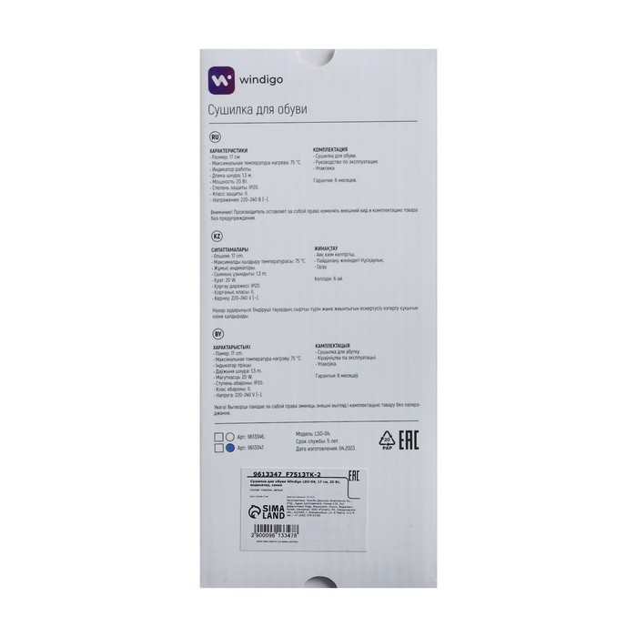 Сушилка для обуви Windigo LSO-04, 17 см, 20 Вт, индикатор, синяя